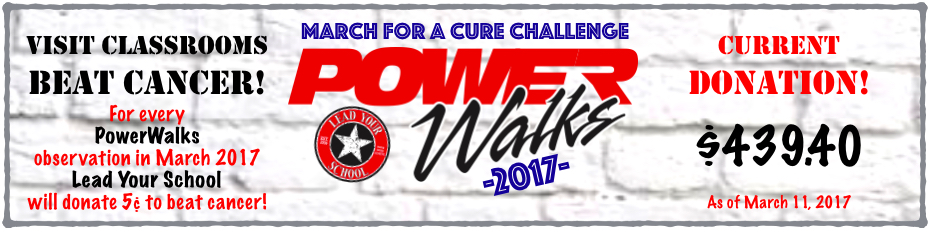 For every PowerWalks classroom observation conducted this month, LYS will donate 5¢ to the American Cancer Society. Every PowerWalks observer who conducts 200 or more classroom observations this month gets a March For A Cure T-shirt.